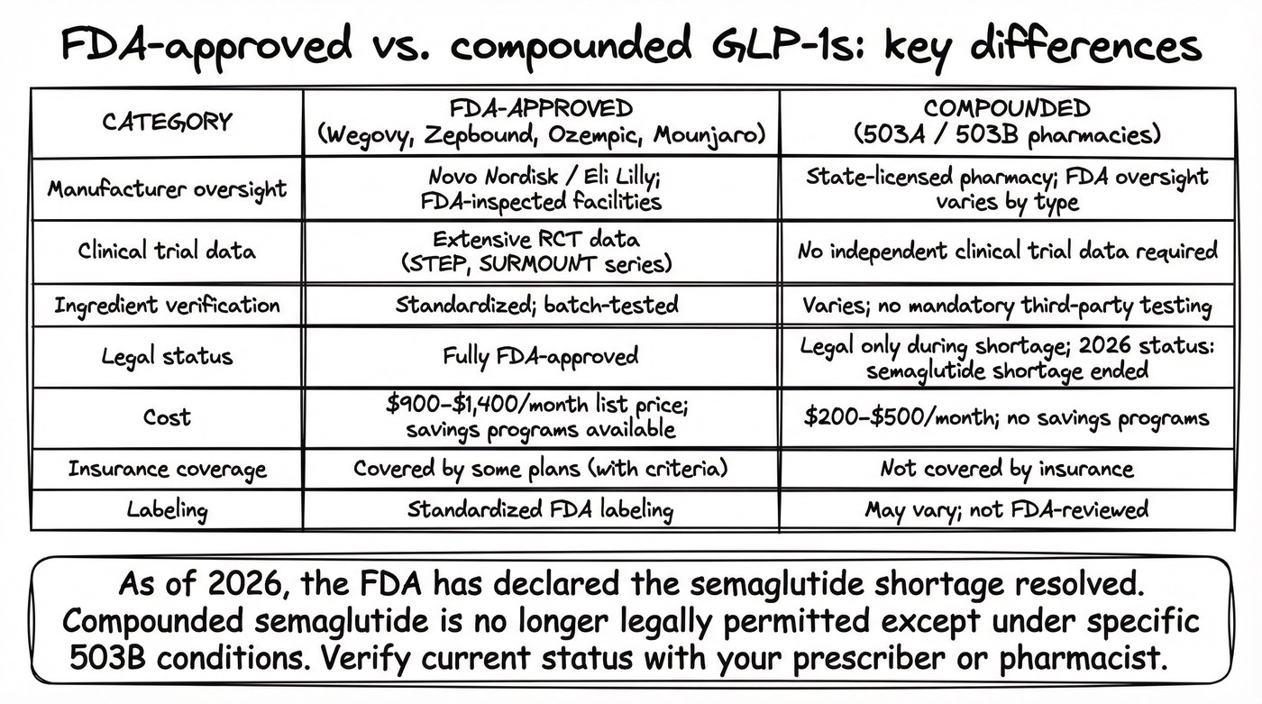 This article is editorial health information intended for general educational purposes. It is not a substitute for individualized medical advice, diagnosis, or treatment. Decisions about GLP-1 medications, whether compounded or FDA-approved, should be made with a qualified healthcare provider who knows your full medical history. Coverage rules, pricing, and regulatory status are subject to change. Verify current information with your prescriber, insurer, and pharmacy.