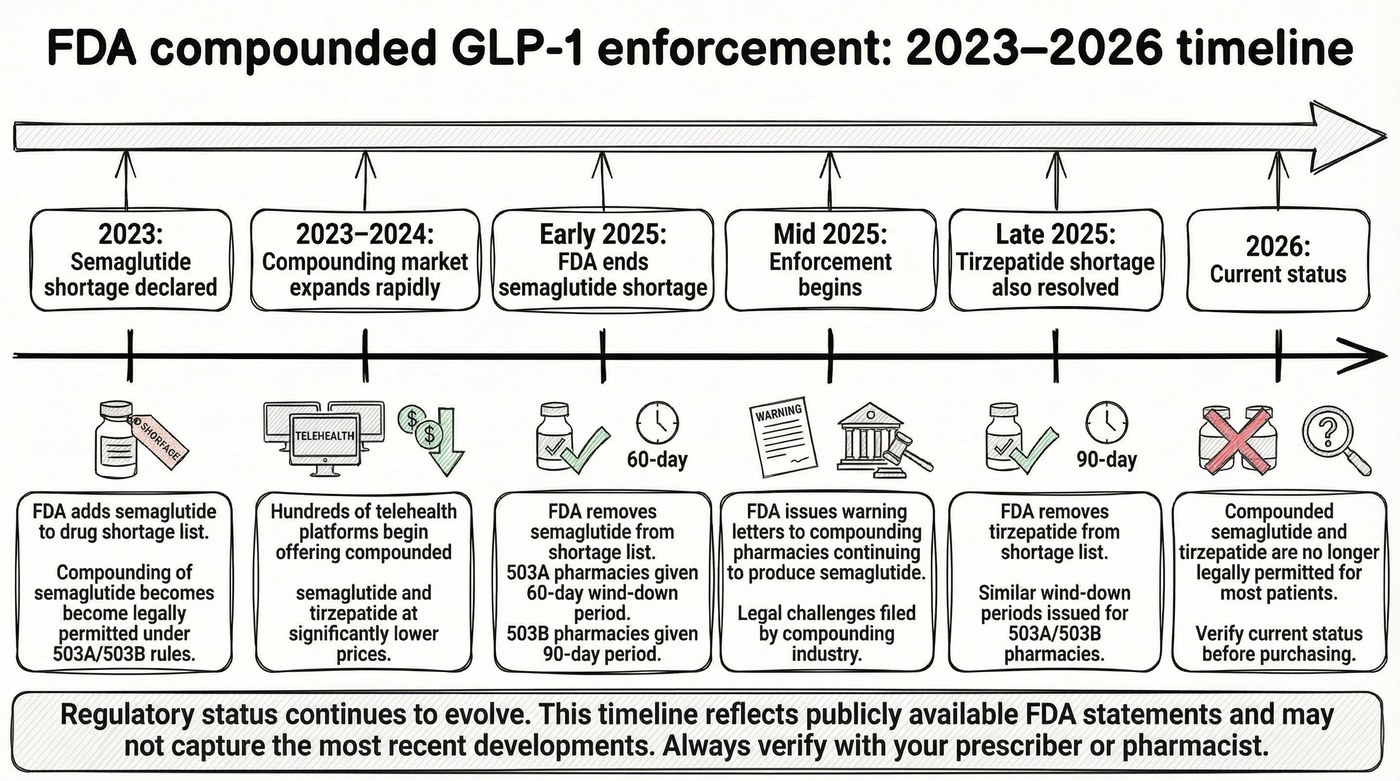 The legal landscape has narrowed. During the drug shortages, compounding was broadly permitted. With tirzepatide removed from the shortage list in December 2024 and semaglutide removed in February 2025, the legal basis for compounding these drugs has contracted. The FDA has issued more than 50 warning letters to pharmacies and telehealth companies. Patients are not typically the target of enforcement, but the availability of compounded products may decline as enforcement continues.