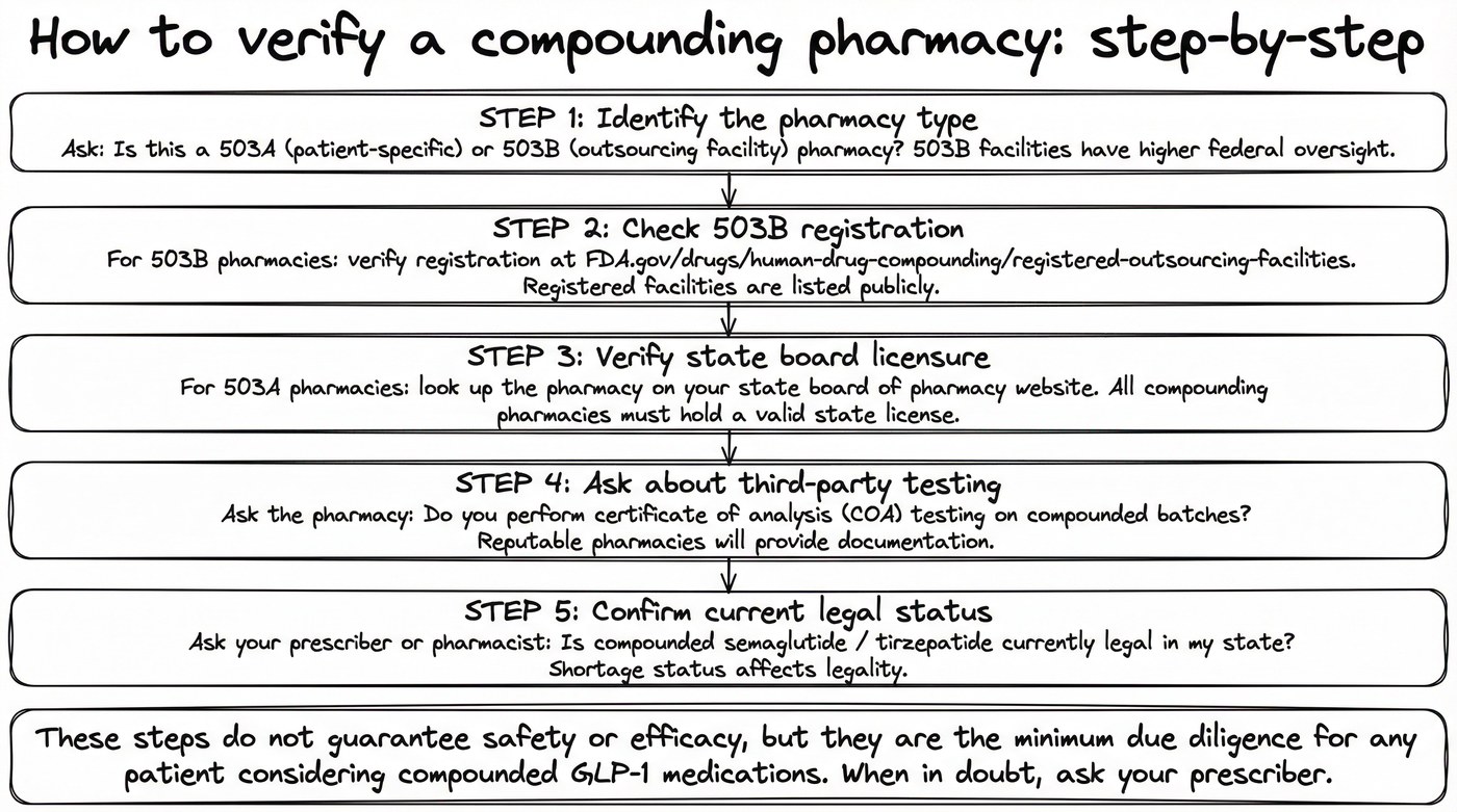 If a patient and their clinician decide that a compounded GLP-1 is the appropriate choice, the quality of the pharmacy matters. Not all compounding operations are equivalent, and patients can take specific steps to evaluate what they are receiving.