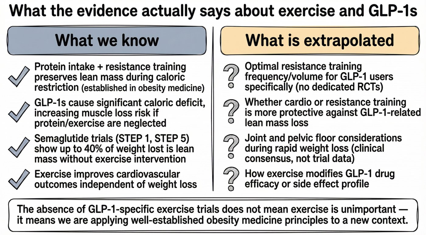 Some early adjacent results are worth noting. A 2026 secondary analysis in Sports Medicine examined combined exercise and liraglutide versus either alone over 52 weeks. The combination group showed stair climb time improved by 8.6%, peak VO2 improved by 3.0 mL/min/kg fat-free mass, and relative muscle strength increased by 3.3% versus a 7.8% decline in the placebo group. These are functional outcomes that matter for daily life. An important caveat: those results come from liraglutide, an older GLP-1 receptor agonist with different dosing and efficacy than semaglutide or tirzepatide. Whether the same exercise-medication interaction holds for the newer agents is plausible but not established.
