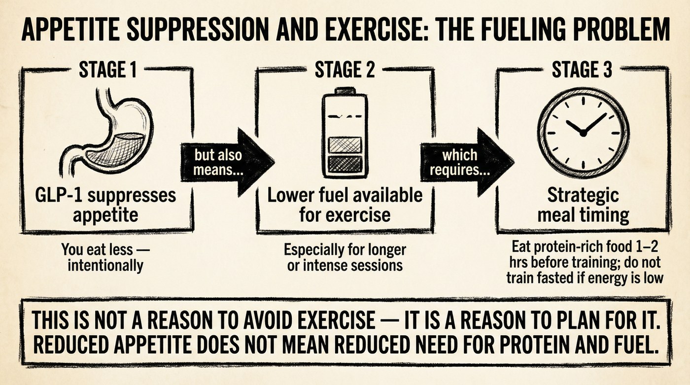- Fatigue during exercise on a GLP-1 often reflects reduced calorie intake rather than a direct drug effect — fueling workouts adequately matters more than it might seem