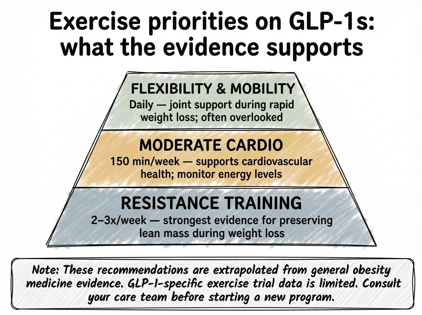 Resistance training has the strongest general evidence for preserving lean muscle mass during weight loss. This matters on GLP-1 medications because the weight loss these drugs produce includes both fat and muscle, a pattern common to most caloric deficits. Lifting weights, bodyweight exercises, and resistance bands are the most studied tools for limiting muscle loss during weight reduction. Aerobic exercise supports cardiovascular health, mood, and energy regulation. Obesity medicine guidelines recommend it as part of treatment, and there is no reason that changes when someone is on a GLP-1 medication. Combined approaches are what most clinical guidelines recommend. Neither modality has been proven superior specifically in GLP-1 users, because that comparison has not been studied in this population. At this stage of the evidence, consistency and sustainability matter more than optimization. The best exercise plan is one you can actually do.
