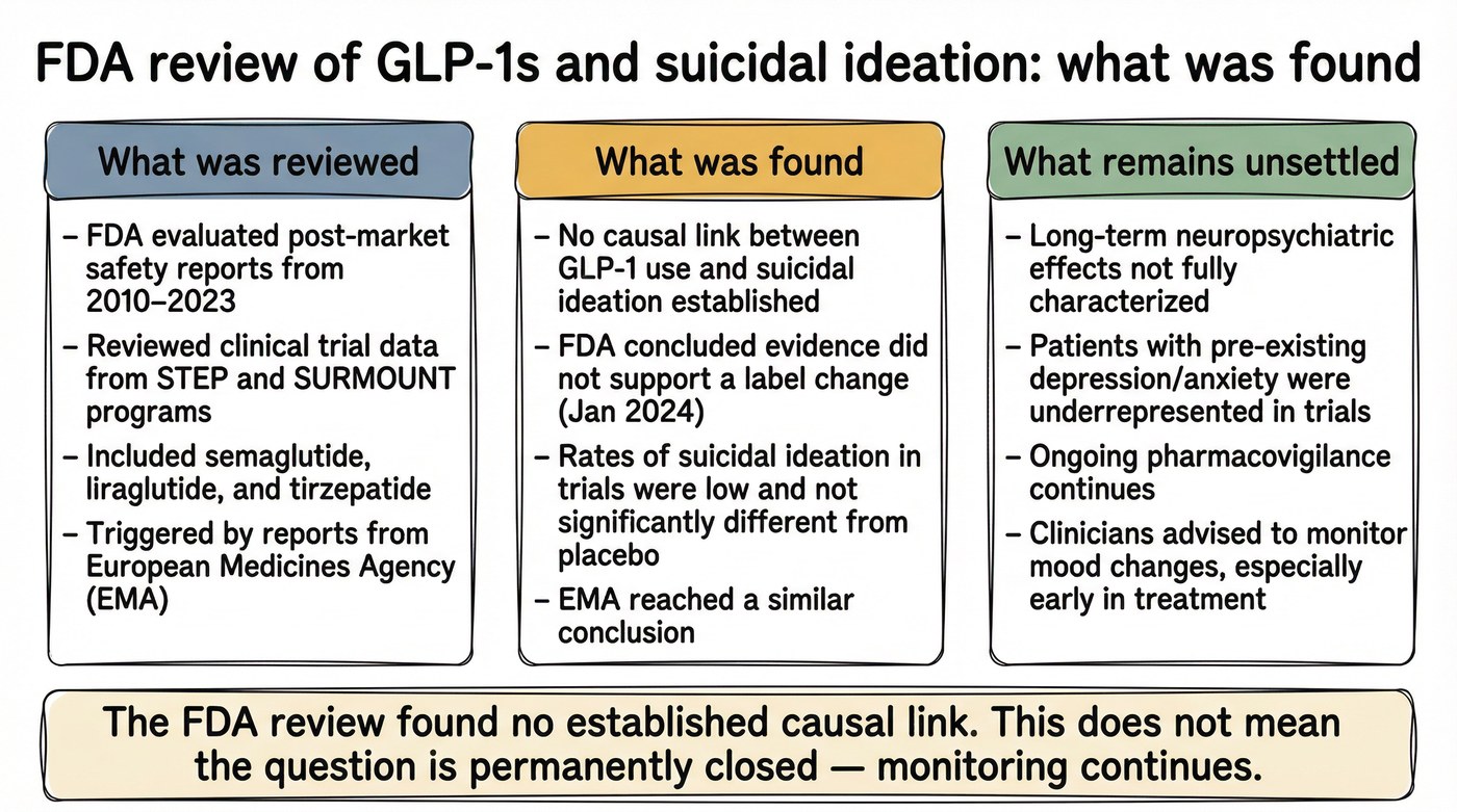 - The FDA completed a formal review in February 2026 and found no evidence that GLP-1 medications cause suicidal ideation, leading to removal of that warning from prescribing labels