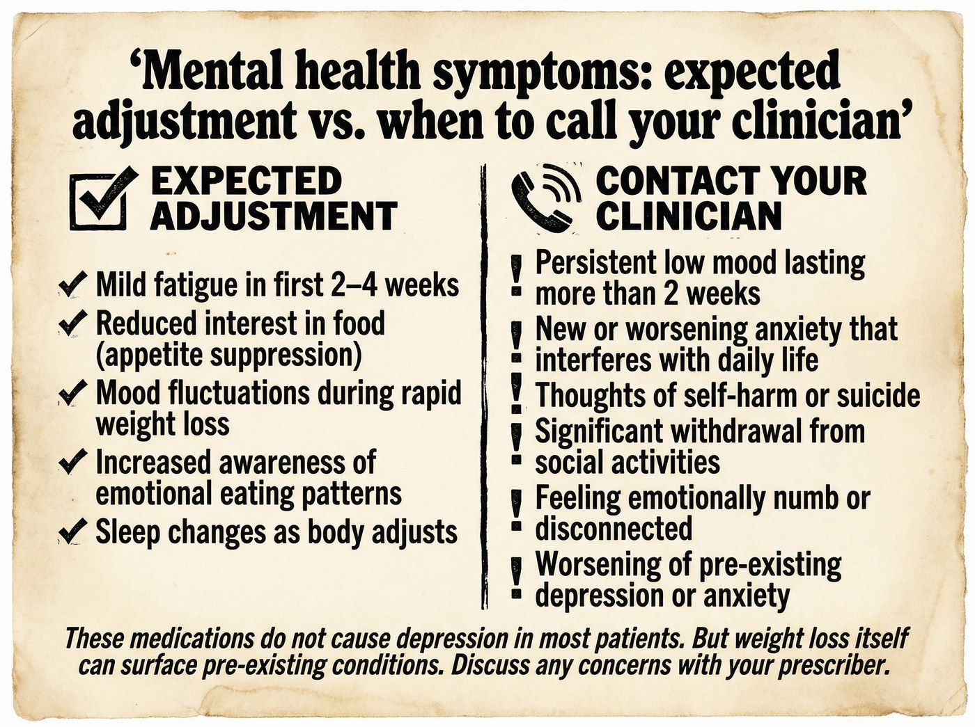 - Patients with a history of depression, anxiety, or eating disorders should discuss this with their prescriber before starting — not because risk is established, but because monitoring is appropriate