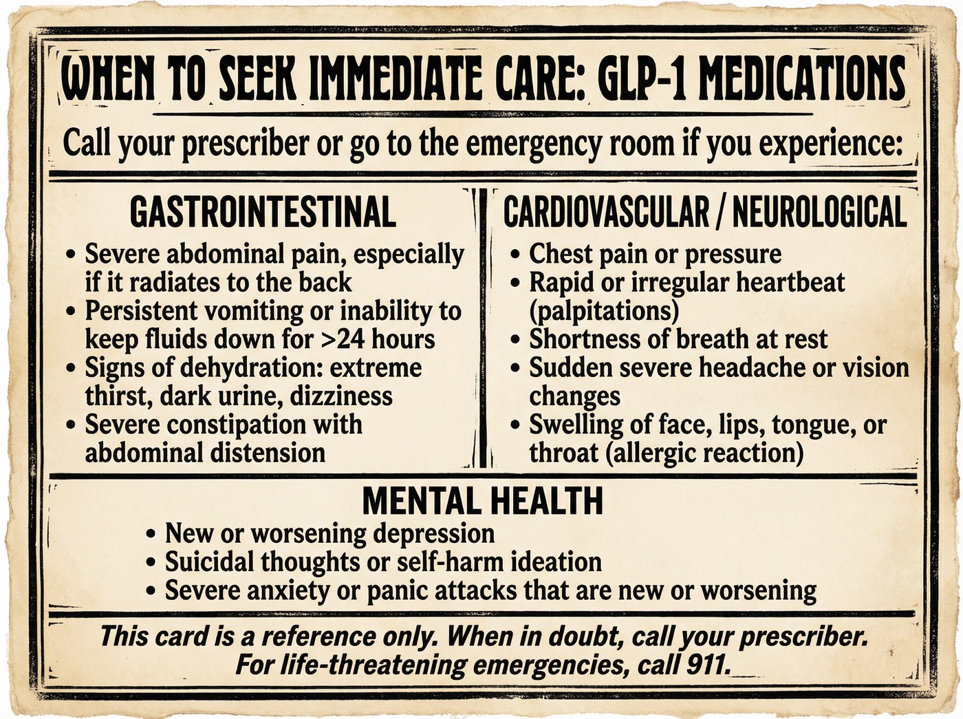 Persistent vomiting, inability to stay hydrated, severe abdominal pain, and symptoms that intensify rather than settle are the kind of changes that move the situation out of generic internet-advice territory and back toward the prescribing clinician. This page can help you separate common from concerning. It cannot replace the conversation with whoever prescribed the medication.