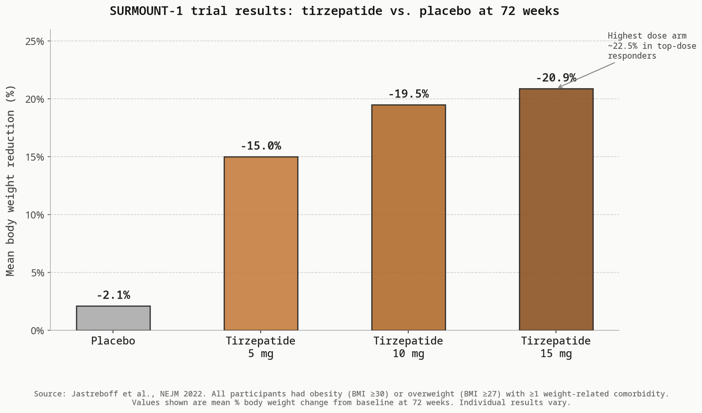 The SURMOUNT-1 trial is the primary clinical evidence base for tirzepatide's use in weight management. It enrolled adults with obesity or overweight (without type 2 diabetes) and ran for 72 weeks.