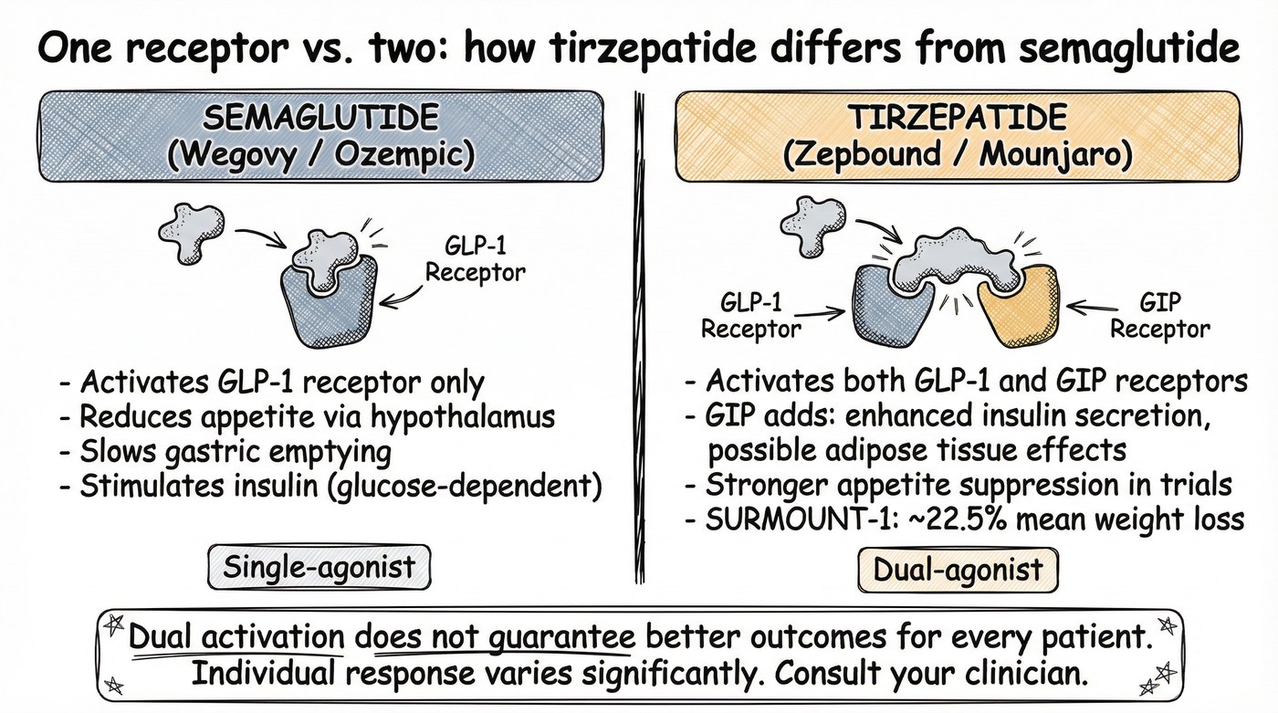 - Tirzepatide activates two gut hormone receptors — GLP-1 and GIP — through a single engineered molecule, which is what separates it mechanically from semaglutide