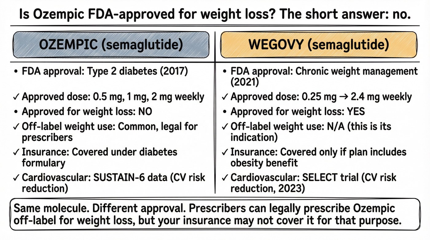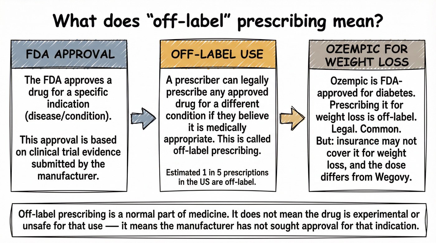 FDA approval means the agency has reviewed clinical evidence for a specific drug, at a specific dose, for a specific use, and determined that the benefits outweigh the risks for that use in the intended population. Off-label prescribing means a licensed clinician prescribes a drug for a use, dose, or patient population outside its FDA-approved labeling. This practice is legal and common across many areas of medicine. Off-label does not mean unsafe or ineffective; it means the FDA has not completed its formal review of that drug for that specific use. When Ozempic is prescribed for weight loss, that is off-label use. The underlying molecule, semaglutide, has been studied for weight management, and that evidence supported Wegovy's approval. But Ozempic itself has not been approved for that purpose. The distinction is about which product, at which dose, has gone through the formal approval process for weight management as an indication.