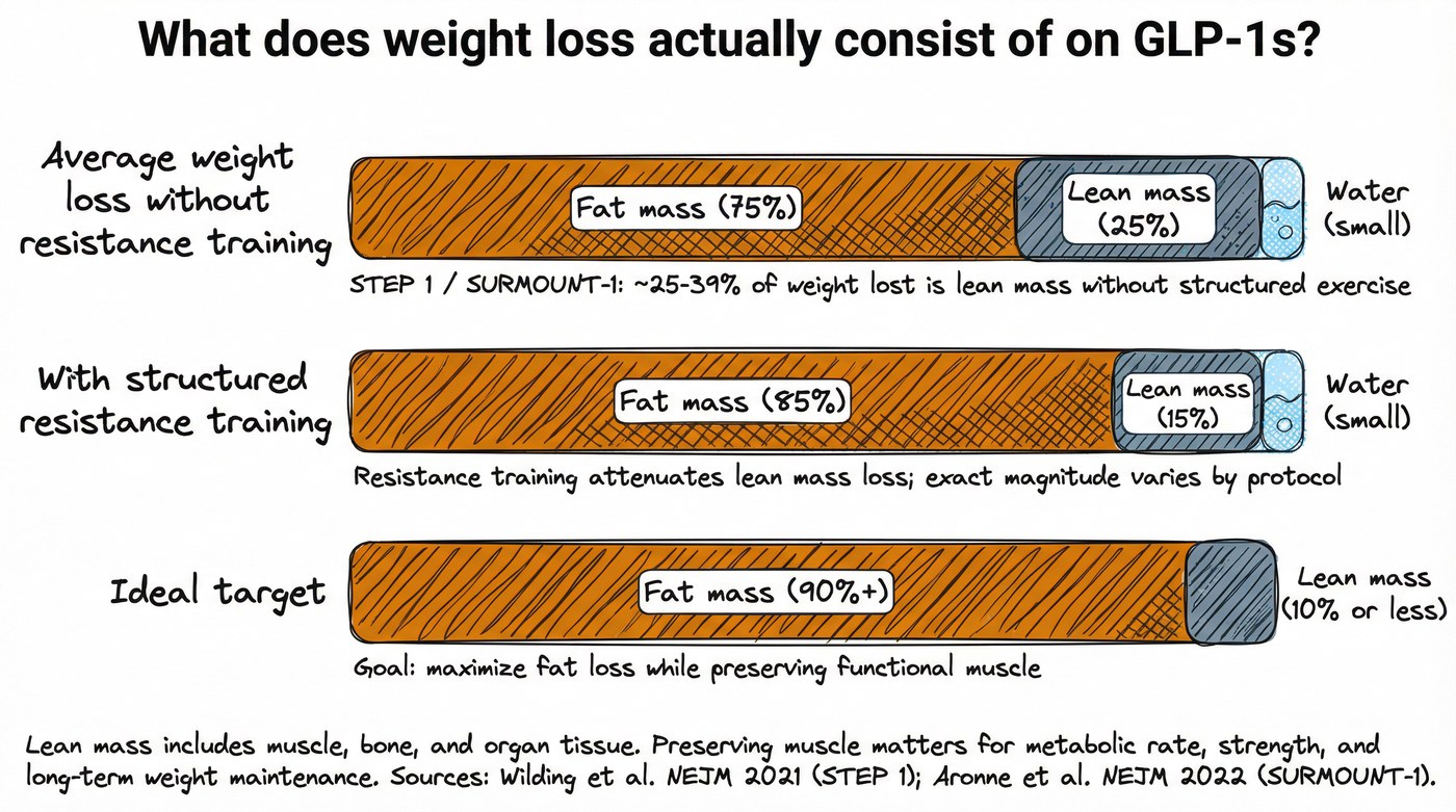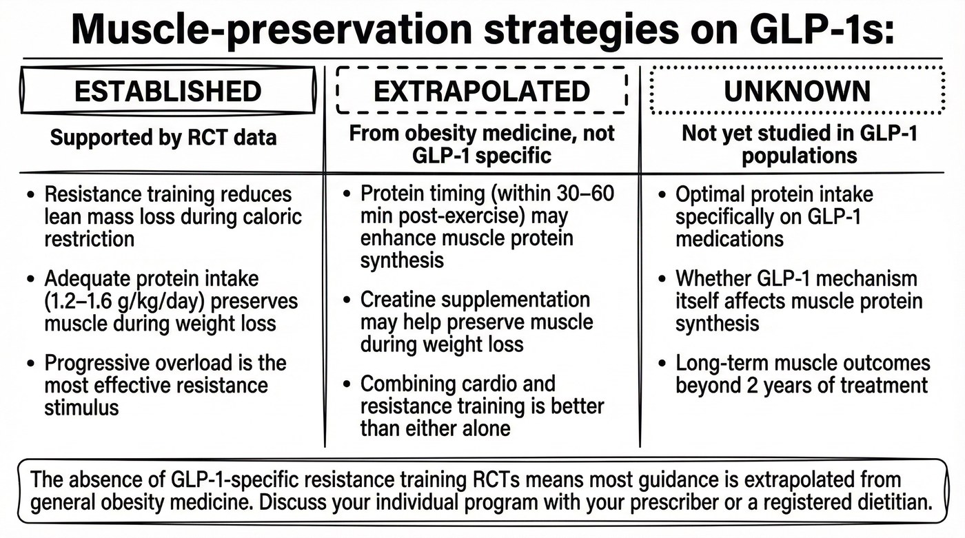 Resistance training is well established as a way to preserve lean mass during weight loss in the general population. However, no randomized controlled trials have specifically examined resistance training in people taking GLP-1 medications. The general evidence is encouraging, but GLP-1-specific guidance does not yet exist.
