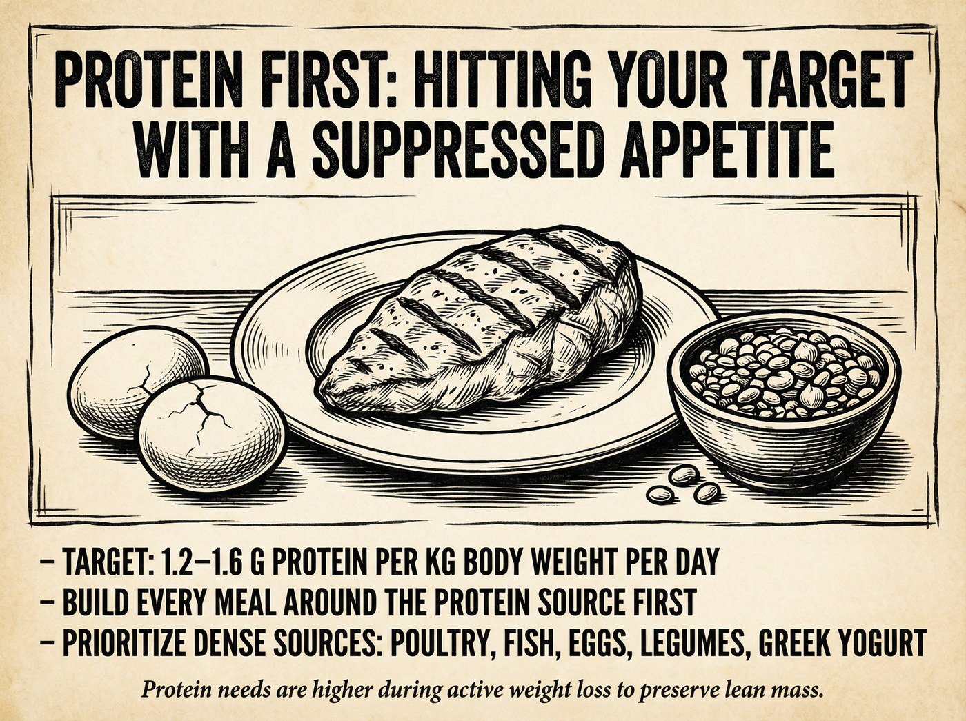 In the broader weight-loss literature (meaning studies of people losing weight through calorie restriction, not specifically through GLP-1 medications) higher protein intake is consistently associated with better preservation of lean mass. The proposed mechanism is straightforward: protein provides the amino acids that muscle tissue needs to maintain and repair itself, and when overall food intake drops, getting enough protein becomes harder. It is reasonable to think this principle applies to people taking GLP-1 medications; there is no biological reason it would not. But reasonable inference is not the same as evidence in this population, and that distinction matters when translating general guidance into specific recommendations. There is a practical wrinkle specific to GLP-1 users: these medications suppress appetite significantly. Many people find that they feel full much sooner than they used to, and eating enough of anything (let alone protein-dense foods) becomes a genuine challenge. Even people who understand the importance of protein may struggle to meet general targets while on these medications. The weight-loss literature discusses a range of protein targets for people in a caloric deficit, but there is no single universally agreed-upon number, and no GLP-1-specific protein trial exists to guide recommendations for this population. Giving you a specific gram-per-day target here would go beyond what the evidence supports. What is appropriate: discussing your current protein intake with your clinician or a registered dietitian, particularly given how your appetite may have changed since starting medication. A dietitian can help you find practical ways to prioritize protein within whatever amount of food you are actually able to eat.