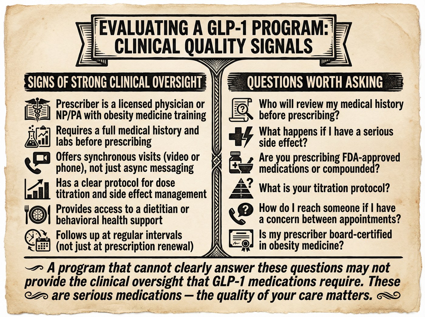 - Quality signals that distinguish a serious program from an access funnel include prescriber credibility, depth of medical history review, clear side effect protocols, and transparent pricing