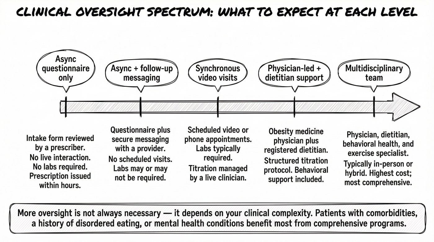 Clinical hybrid programs combine in-person visits with telehealth follow-up. They're often anchored at a hospital system, academic medical center, or an obesity medicine practice. A typical model might involve an initial in-person evaluation followed by ongoing monitoring through a mix of in-person and virtual appointments, with a multidisciplinary team that may include a physician, a registered dietitian, and a behavioral health provider. This structure most closely aligns with the Obesity Medicine Association's standards, which call for comprehensive assessment of weight history, nutrition, behavior, and long-term treatment planning. That doesn't make every hybrid program excellent, but the structure creates more opportunities for that kind of care. Questions worth asking: Does the program have a defined protocol for patients who plateau or experience side effects? Are surgical options discussed when they're clinically appropriate?