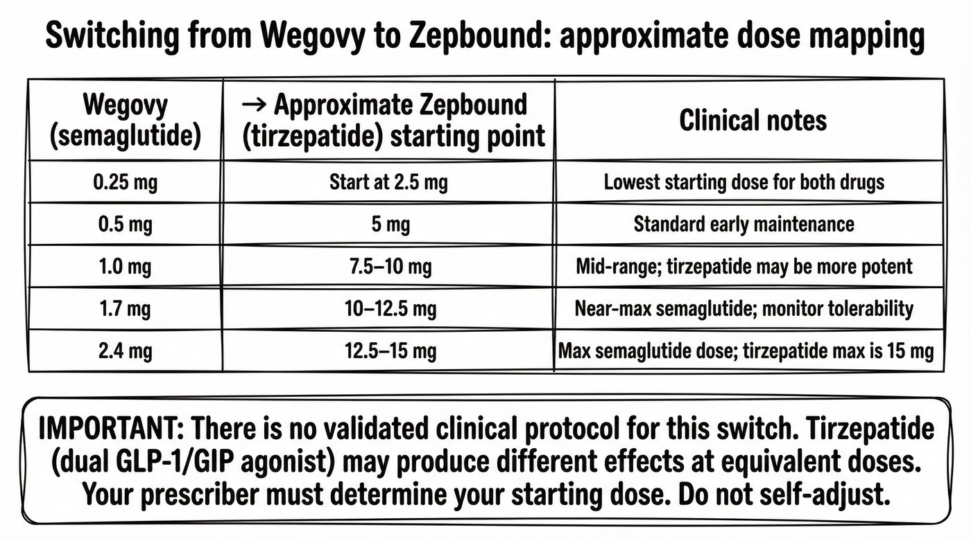 - No FDA-approved protocol exists for switching from Wegovy to Zepbound — clinicians make these decisions case by case, and dose equivalence between the two drugs has not been formally established