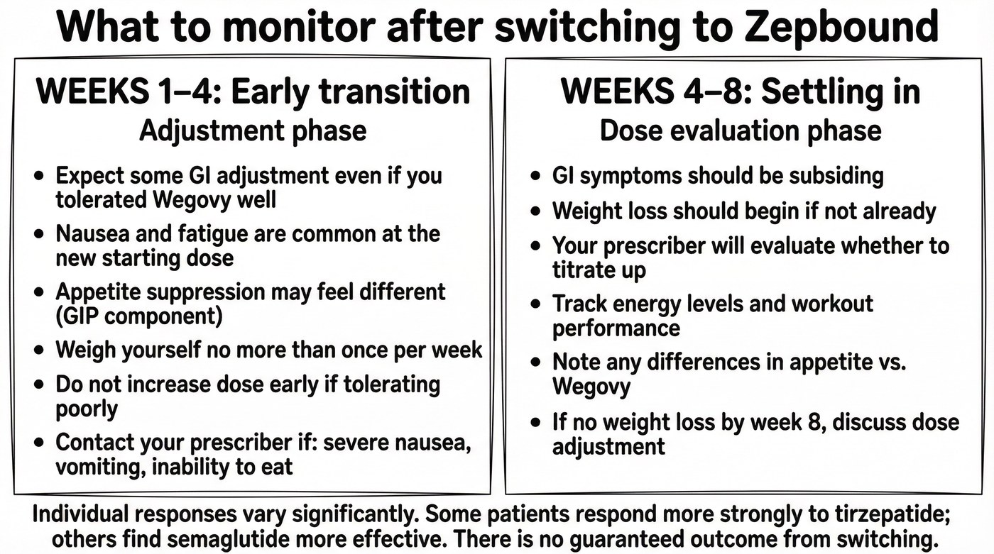 Some patients see improved weight loss after switching. The dual GIP/GLP-1 mechanism of Zepbound is pharmacologically distinct from Wegovy, and some individuals respond better to it. Others see similar results, or experience a temporary plateau. The transition period, while re-escalating through lower doses, is not the right time to judge whether the new medication is working. Efficacy should be assessed after a patient has been at a stable therapeutic dose for a sustained period, not during early escalation. GI side effects may return. Even patients who had fully adapted to Wegovy may experience nausea or other symptoms when starting Zepbound. This is expected during re-escalation and typically improves as the body adjusts. Individual response is hard to predict. The evidence base for switching between these agents is limited, and no one can say with certainty how a given patient will respond. Frequent follow-up with your clinician is the most reliable way to catch problems early and adjust the plan accordingly.