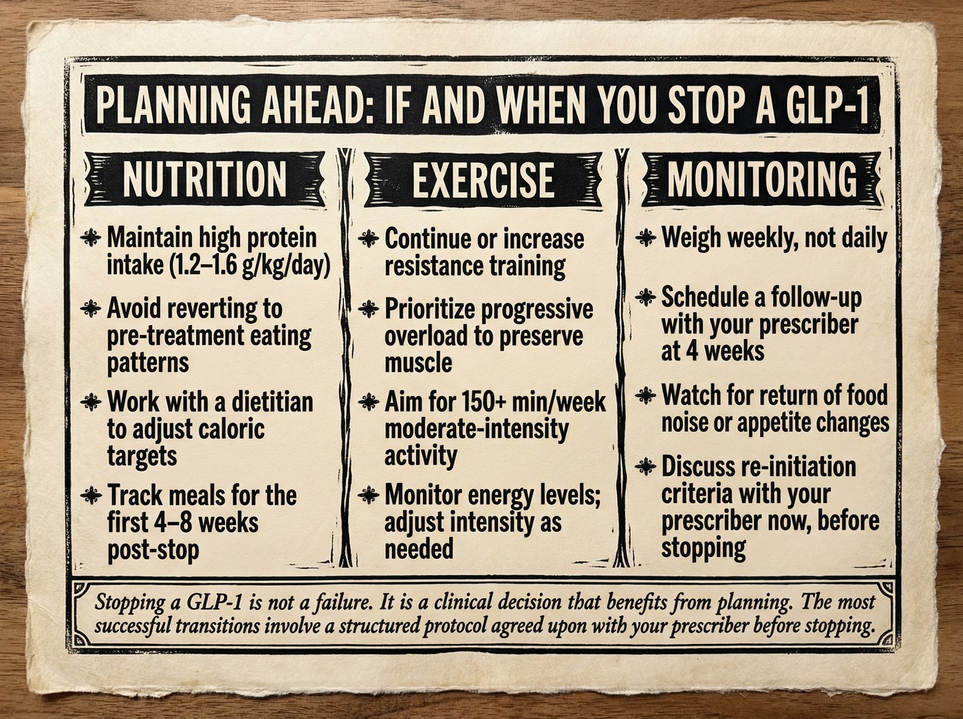 Ideally: a clear reason for stopping, a monitoring plan for weight and relevant metabolic markers, and a defined next step — whether that is a medication switch, lifestyle intensification, or a scheduled restart.