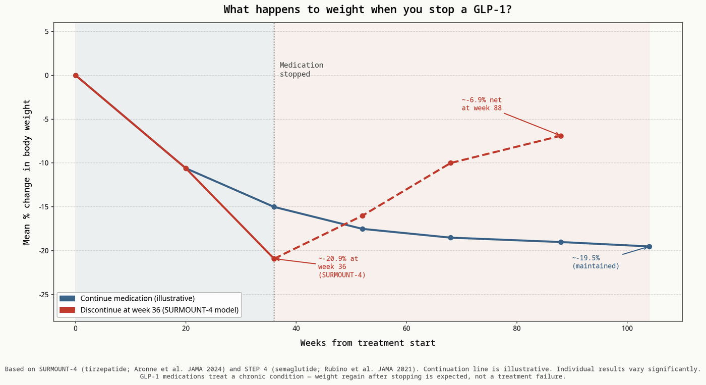 Stopping a GLP-1 medication does not automatically mean losing all the progress you made. Real-world outcomes are more varied than trial data suggest, and the difference is largely explained by what patients do next. Planning the off-ramp is part of the treatment. If you are on a GLP-1 medication, or considering one, ask your care team about discontinuation scenarios now — not because stopping is likely or imminent, but because a plan in place makes the outcome better if it ever becomes necessary.