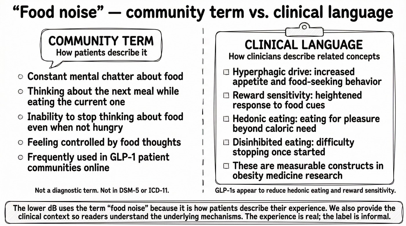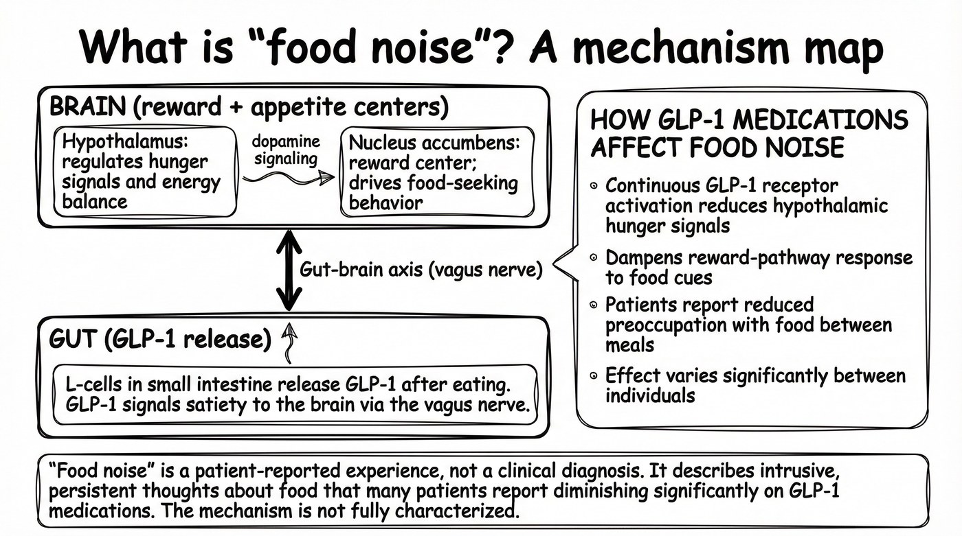 Food noise is not a formal diagnosis. It is a patient-community term for the constant mental pull of eating, planning, craving, and negotiating with appetite.